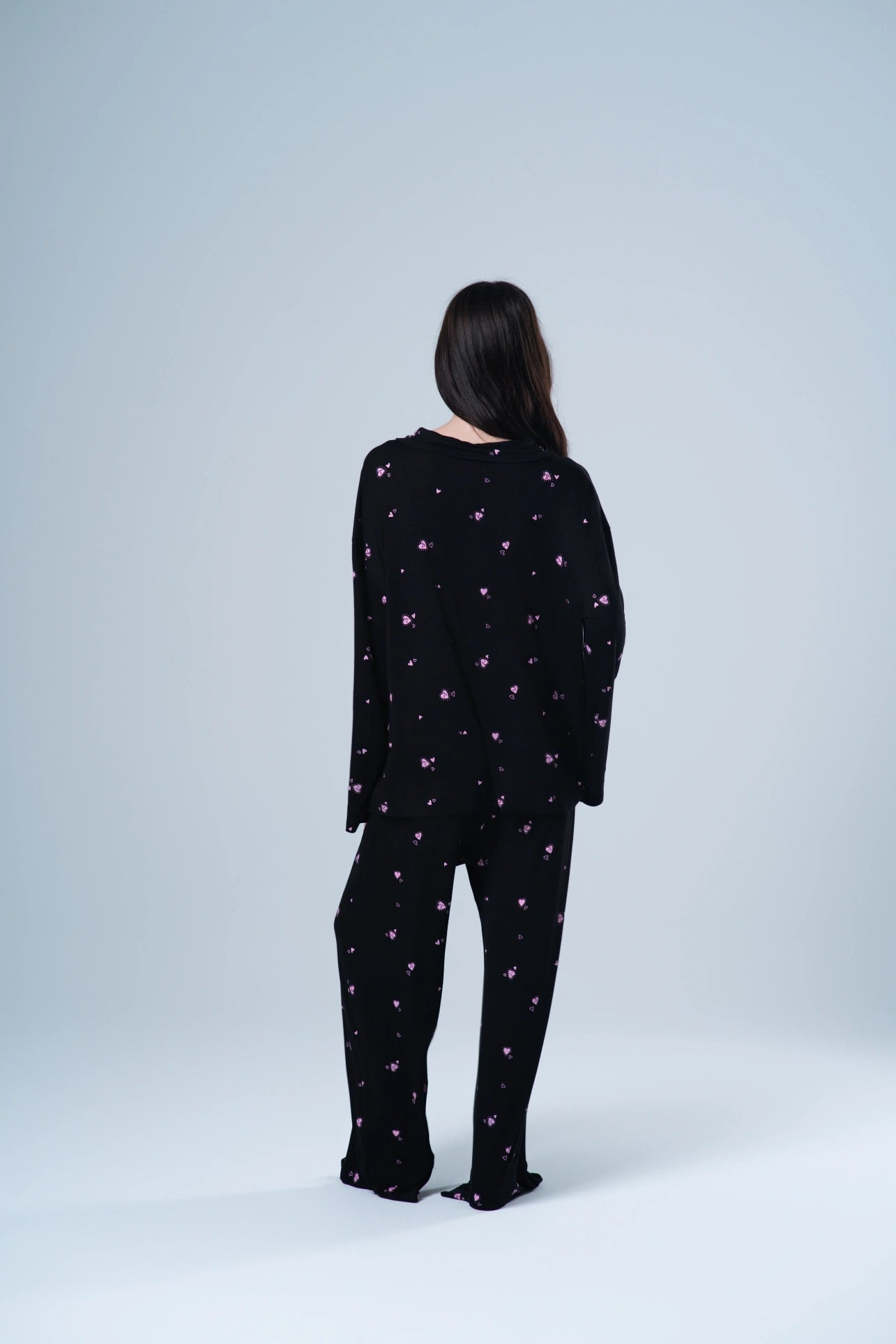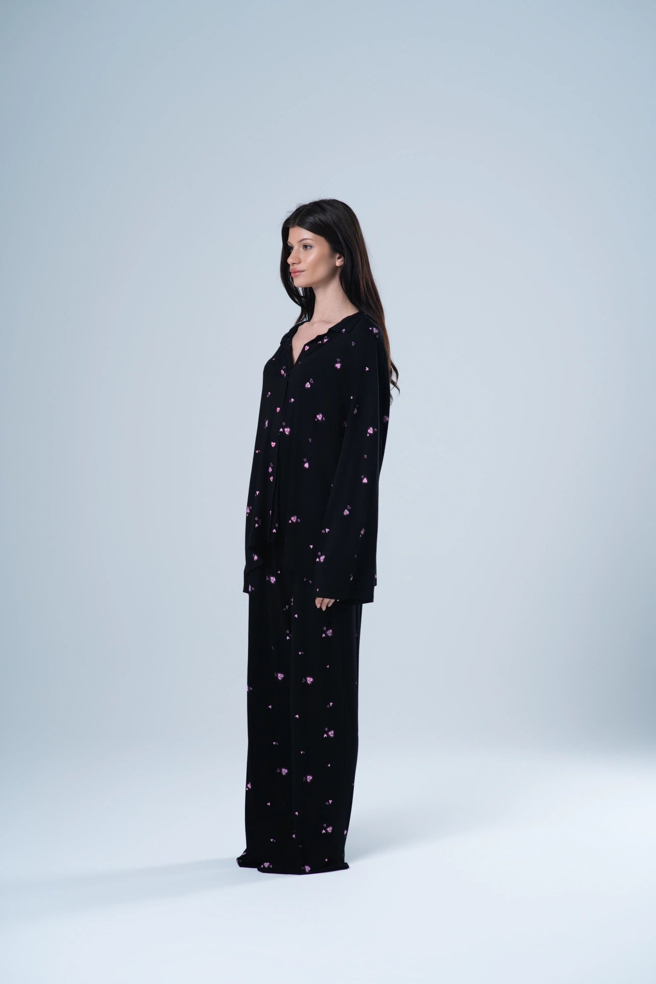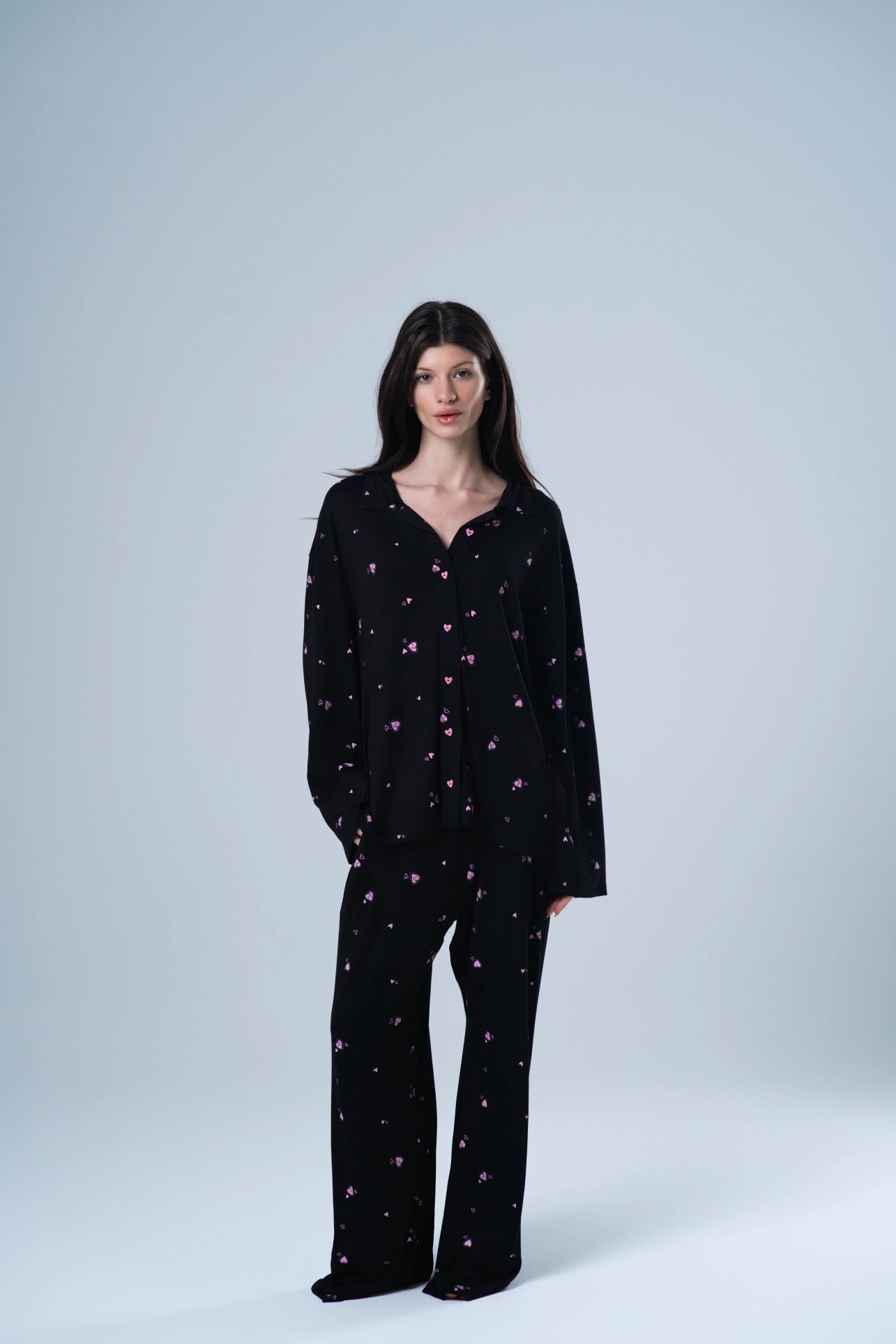 because love isn’t always serious — sometimes it moves. the dancing heart pajama carries that energy: playful, light, a little undone. the kind of set that feels personal even when no one else sees it. made for nights that don’t need an audience.
