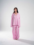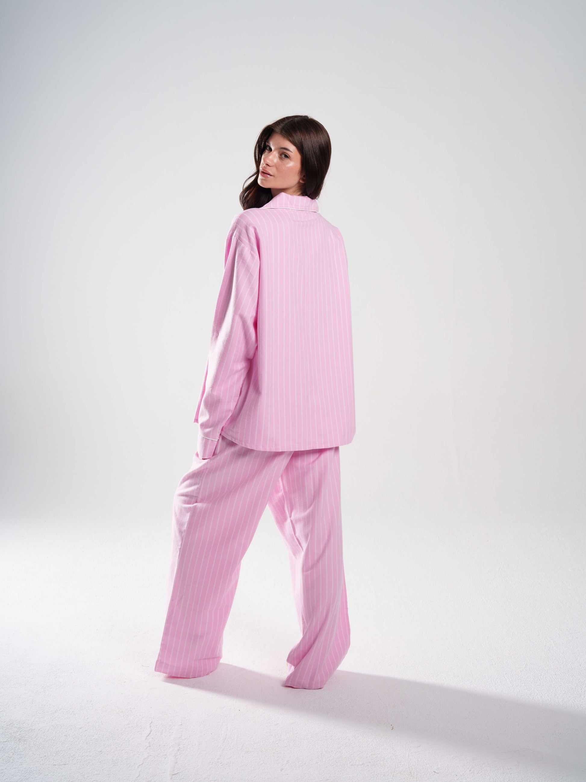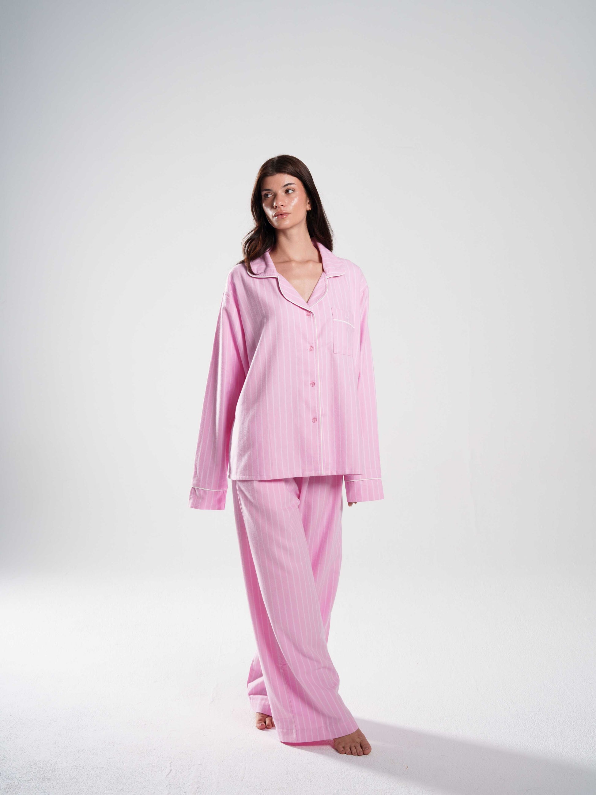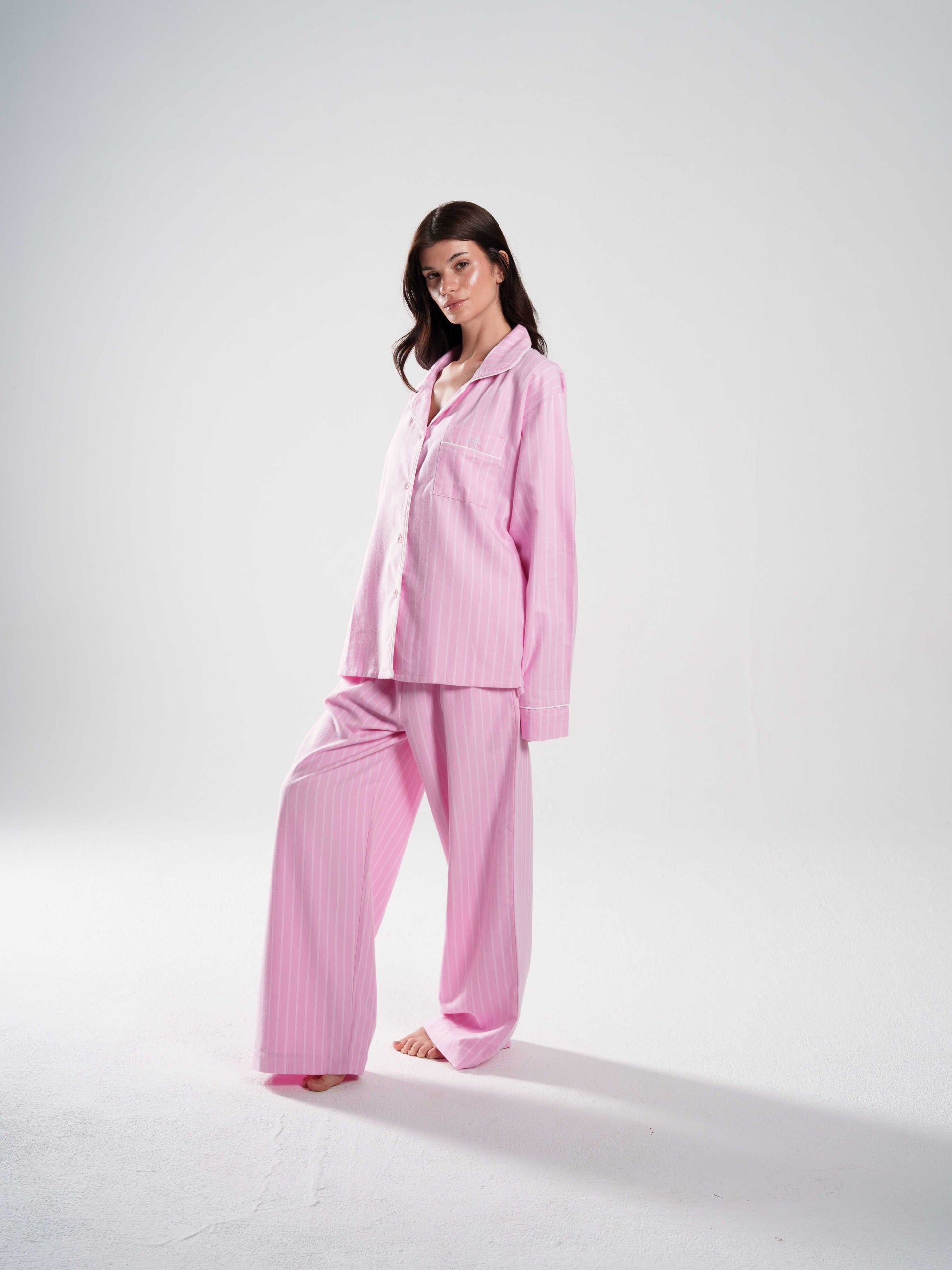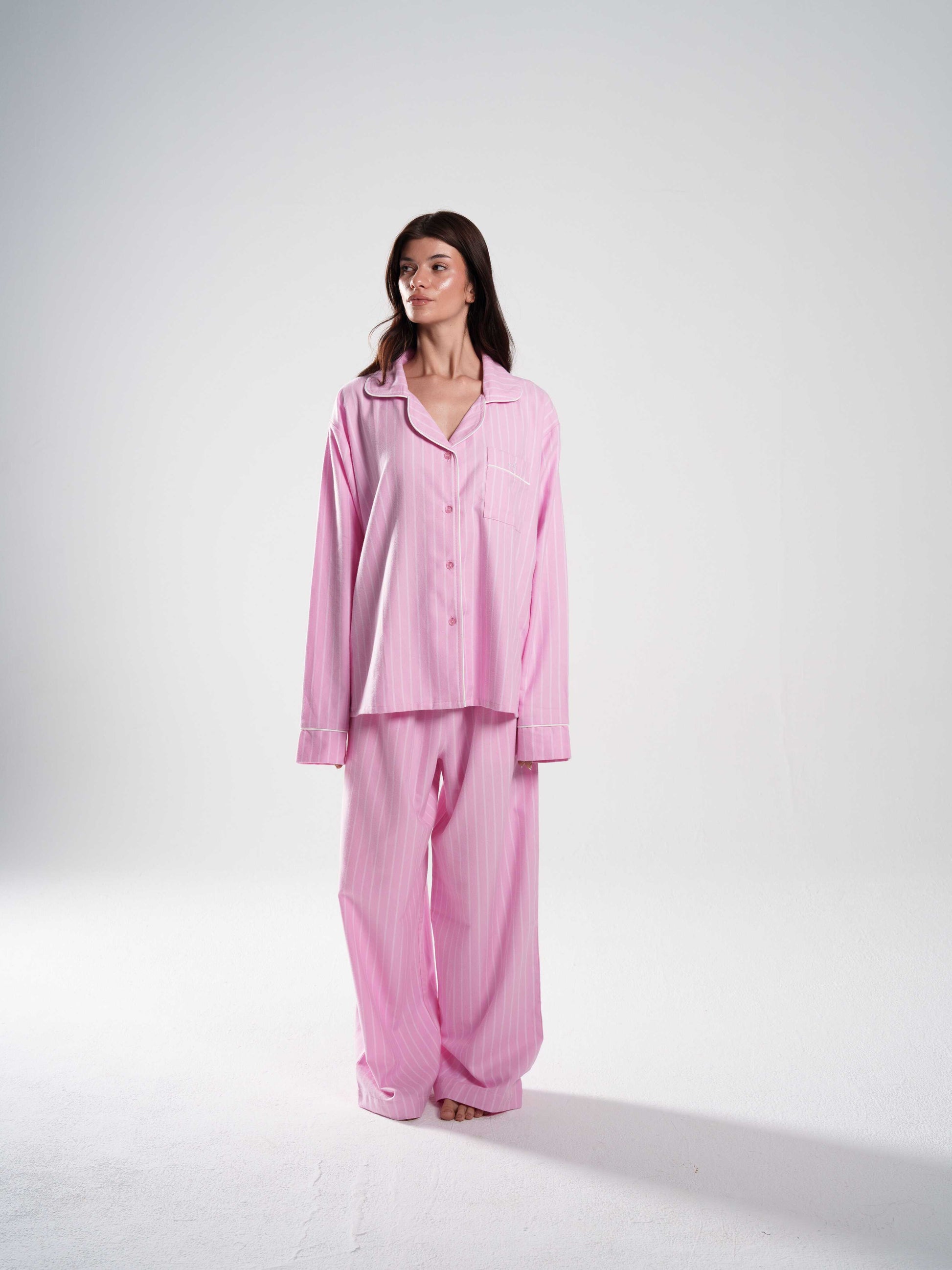 seen in dreams. soft stripes, softer feeling. this set lives somewhere between sleep mode and serenity — the kind of pajamas you drift into, not put on.