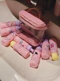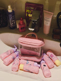 born from chaos, made for control — just bigger. this is the set for girls who don’t edit their routine just to fit a bag. 8 bottles, same no-leak promise, same imperfect shapes. refill, reuse, and take it all with you. your rituals didn’t shrink, so why should your bottles?