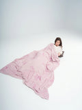 a soft pink snowfall — stars, moons, flakes, planets. the kind of blanket that turns your couch into a cloud.