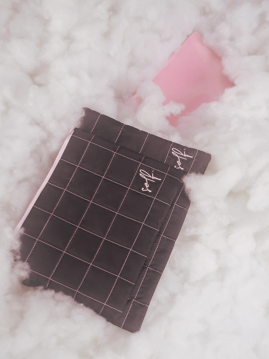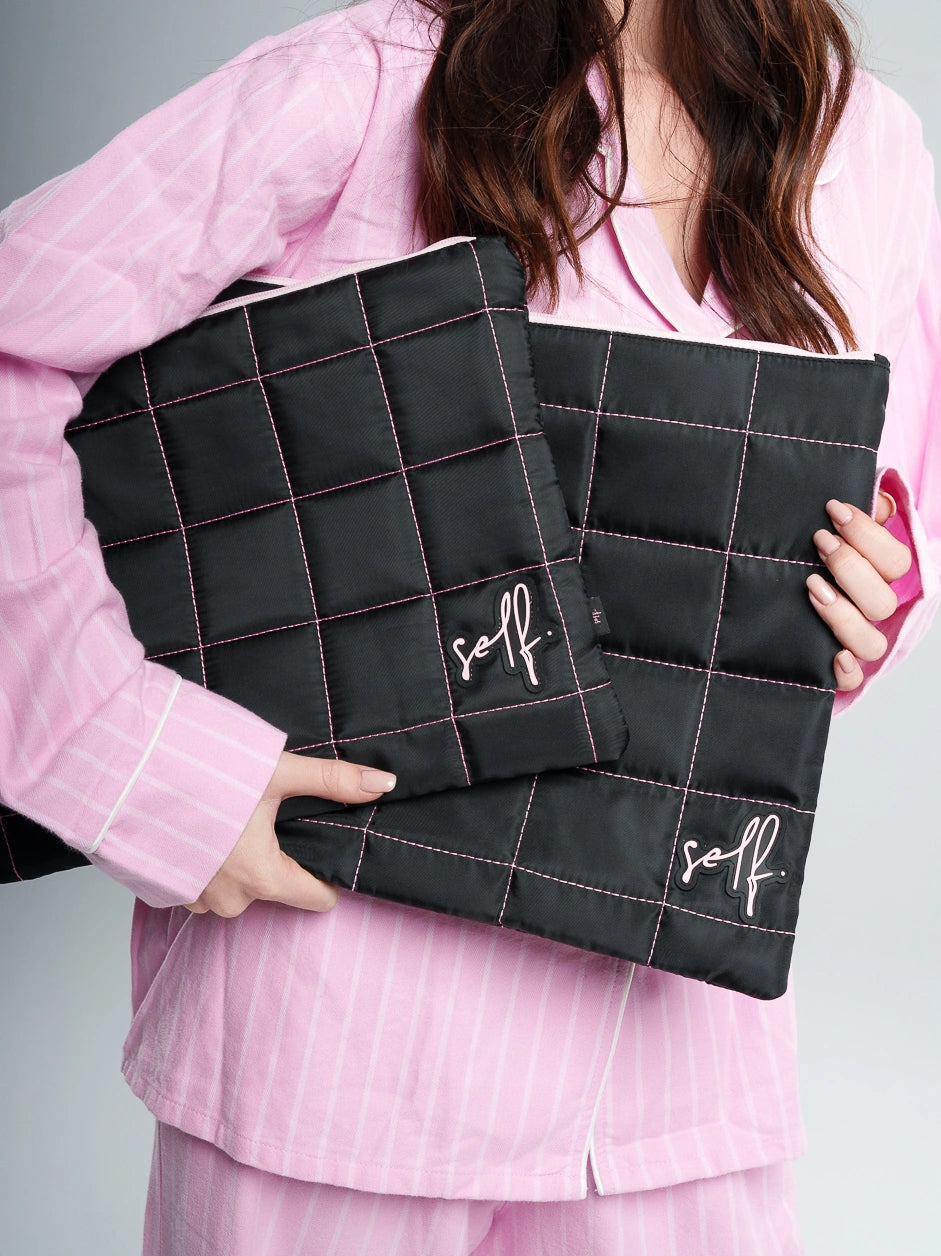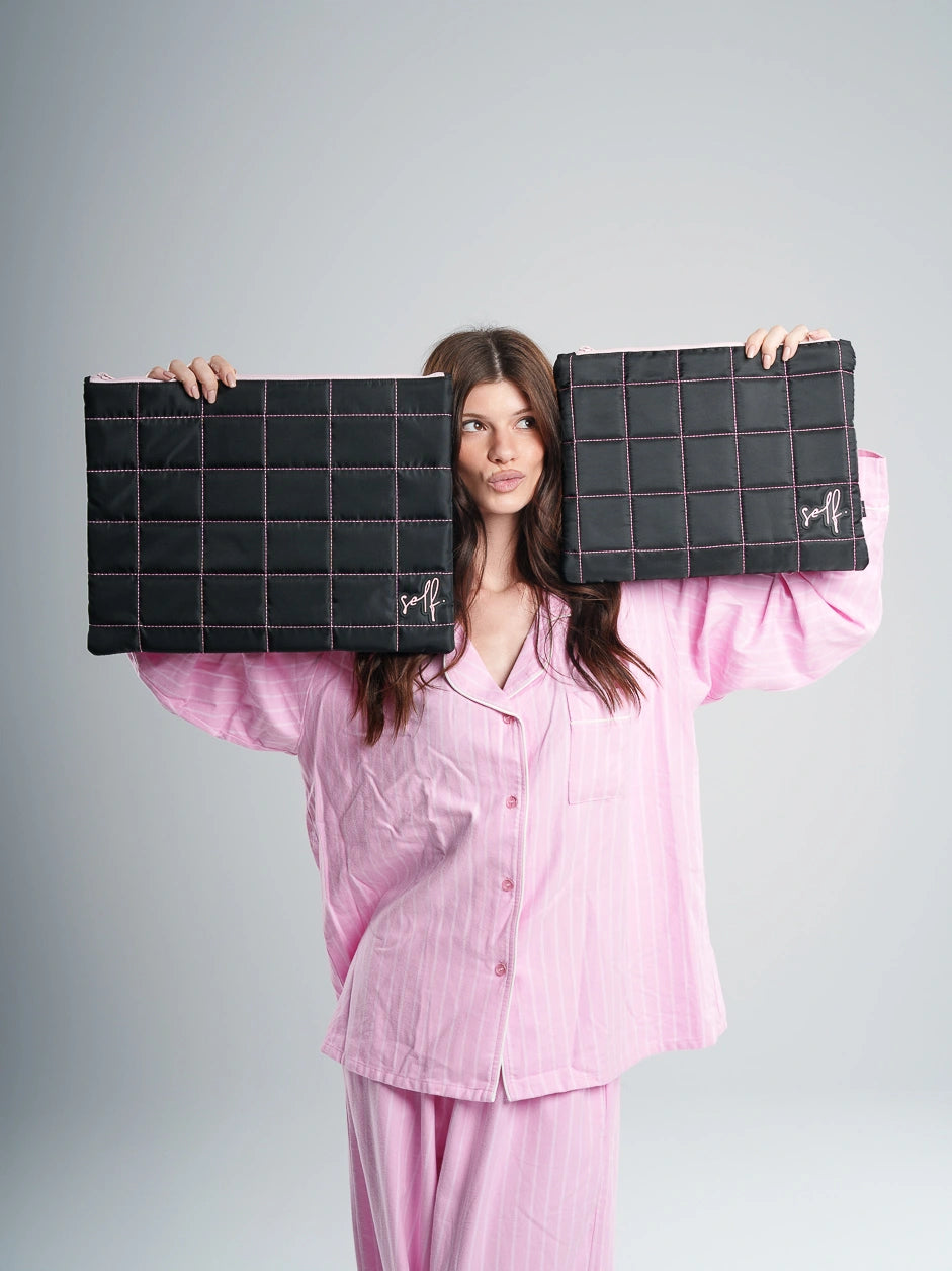 because your laptop deserves a pretty sleeve — padded, quilted, stitched in hot pink, lined in velvet, and fits like a glove. what more could you need?