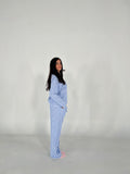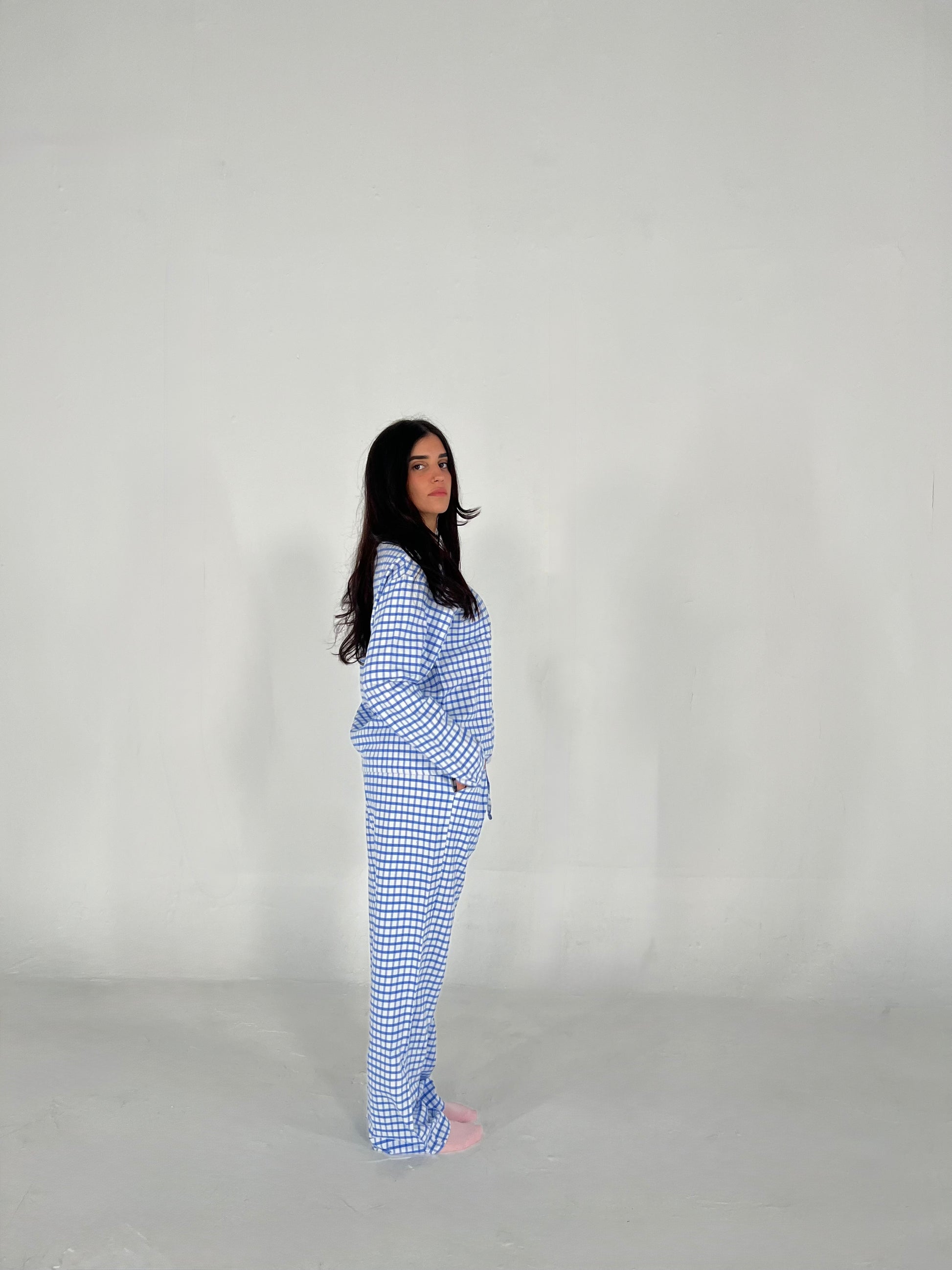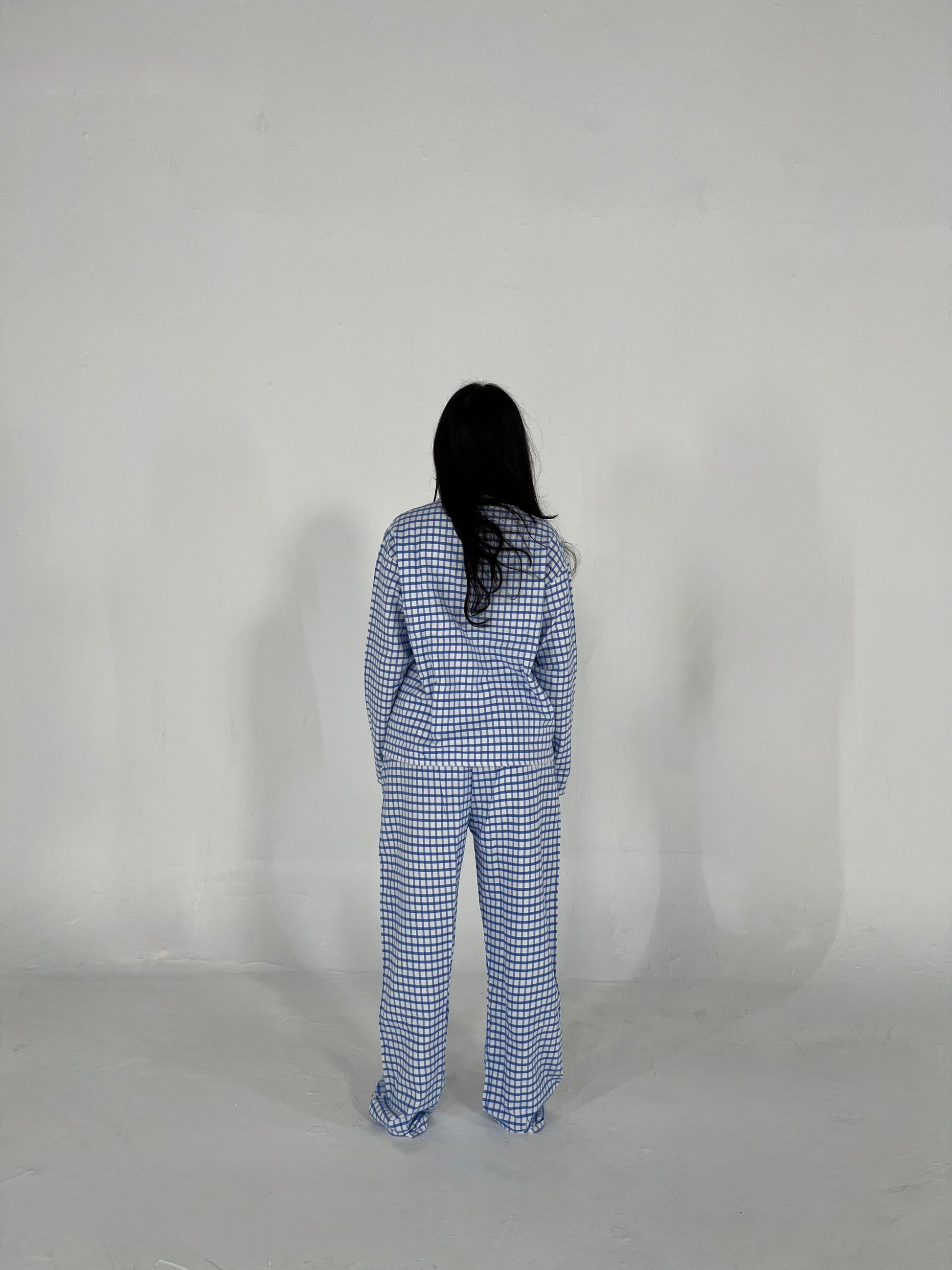 the hour between day and night — but wearable. calm blue stripes, a quiet silhouette, and that slow-shift feeling of coming home to self.